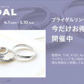 2026年4月1日(水)〜2026年5月10日(日)までの期間中、THE KISS Anniversaryのブライダルリングをご成約のお客さまに、お得…