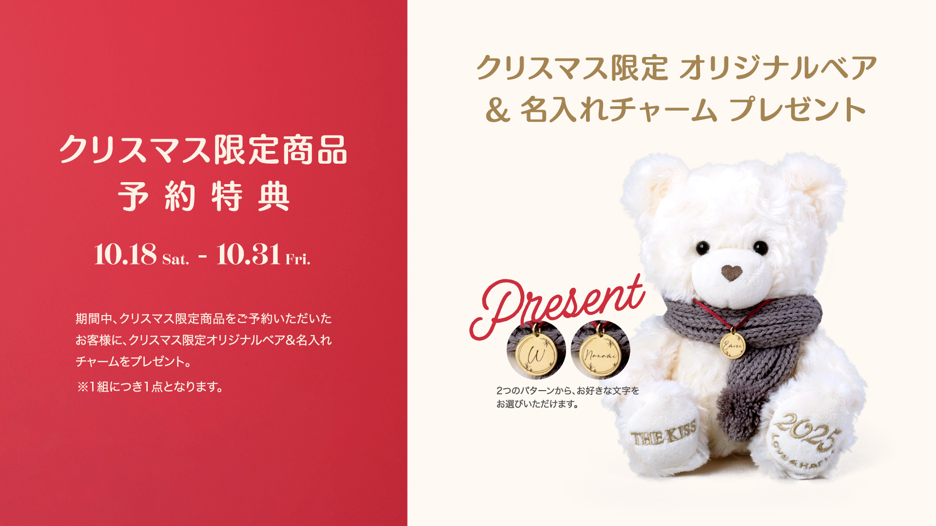 期間中、クリスマス限定商品をご予約いただいたお客様限定で、商品お渡し時に《クリスマス限定オリジナルベア&名入れチャーム》をプレゼント!