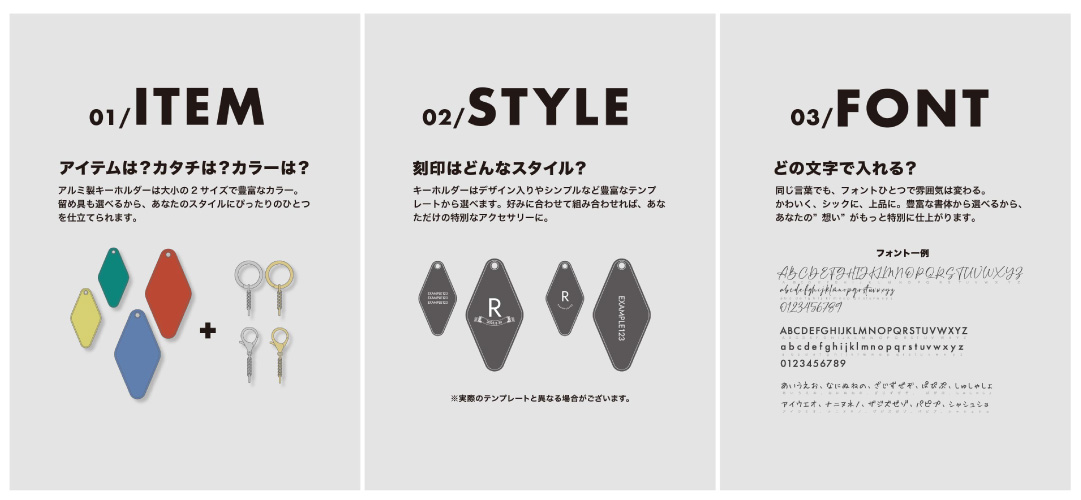 キーホルダーはデザイン入りやシンプルなど豊富なテンプレートから選べます。