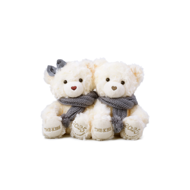 THE KISSのオリジナルベア『LOVE』と『HAPPY』が、シックなグレーカラーのマフラーをつけた冬らしい装いで登場。